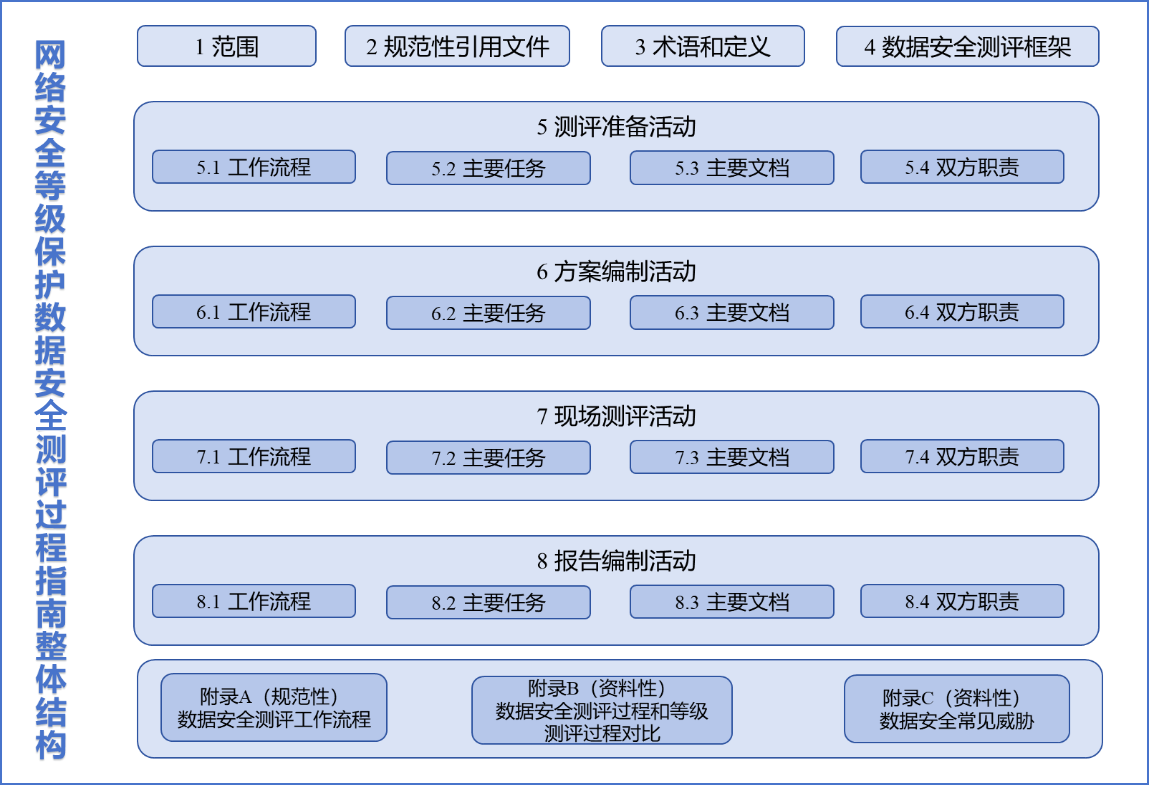 该标准共设8章及3个附录,在继承GB/T 28449—2018《信息安全技术 网络安全等级保护测评过程指南》等级测评方法的基础上,进一步将测评对象聚焦于数据和数据处理活动,测评方法结合数据流动特点进行适配,构建网络安全等级保护框架下的数据安全测评体系。